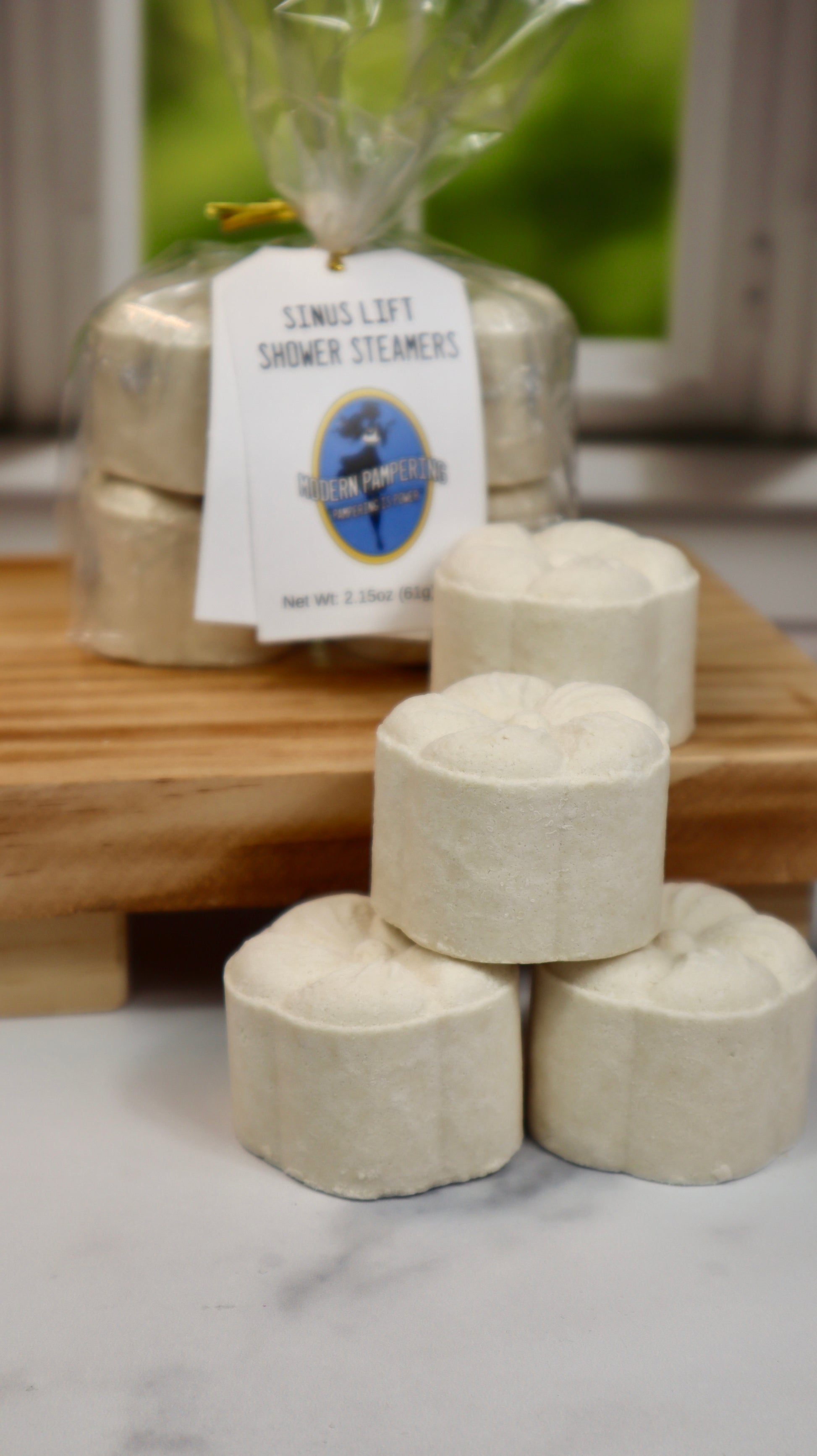 Sinus Lift Shower Steamers has both essential oils and fragrance oils that are a blend of effervescent camphor, eucalyptus, and rosemary. With menthol to give it that kick that our customers say is reminiscent of Vicks Rub.